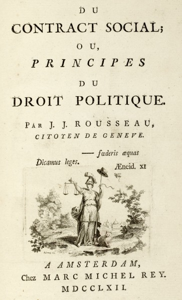 Dans son Contrat social, publié en 1762, Rousseau propose un pacte entre les citoyens dans le but de remédier aux inégalités persistantes de la société. Il examine les conditions, essentielles et circonstancielles, d’une société légitime. Les premières sont exprimées par les notions de contrat social et de volonté générale. Il n’y a de société que formée par la libre volonté de ses membres, aucune autorité que celle de leur volonté commune : « Chacun de nous met en commun sa personne et toute sa puissance sous la suprême direction de la volonté générale ; et nous recevons en corps chaque membre comme partie indivisible du tout ». Mais il faut aussi que des circonstances exceptionnelles permettent à un peuple de recouvrer sa liberté. C’est à cette possibilité que correspond l’idée de révolution.